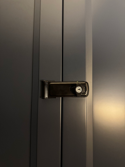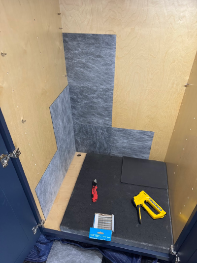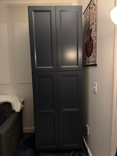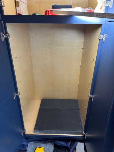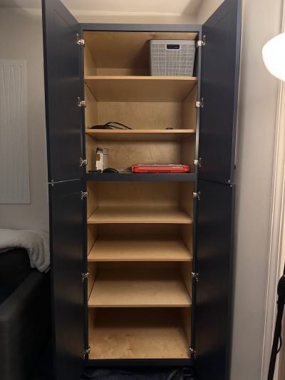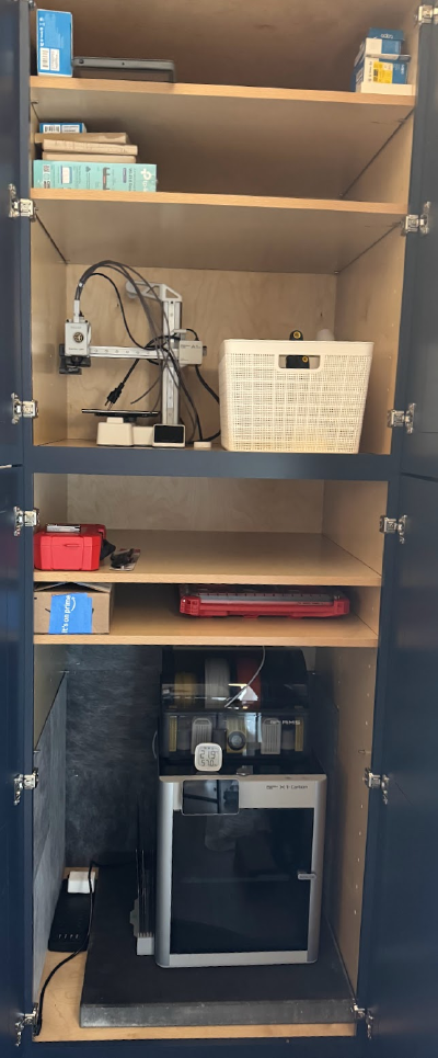 A blue kitchen cabinet, whose primary purpose is to house 3D printers and associated junk.