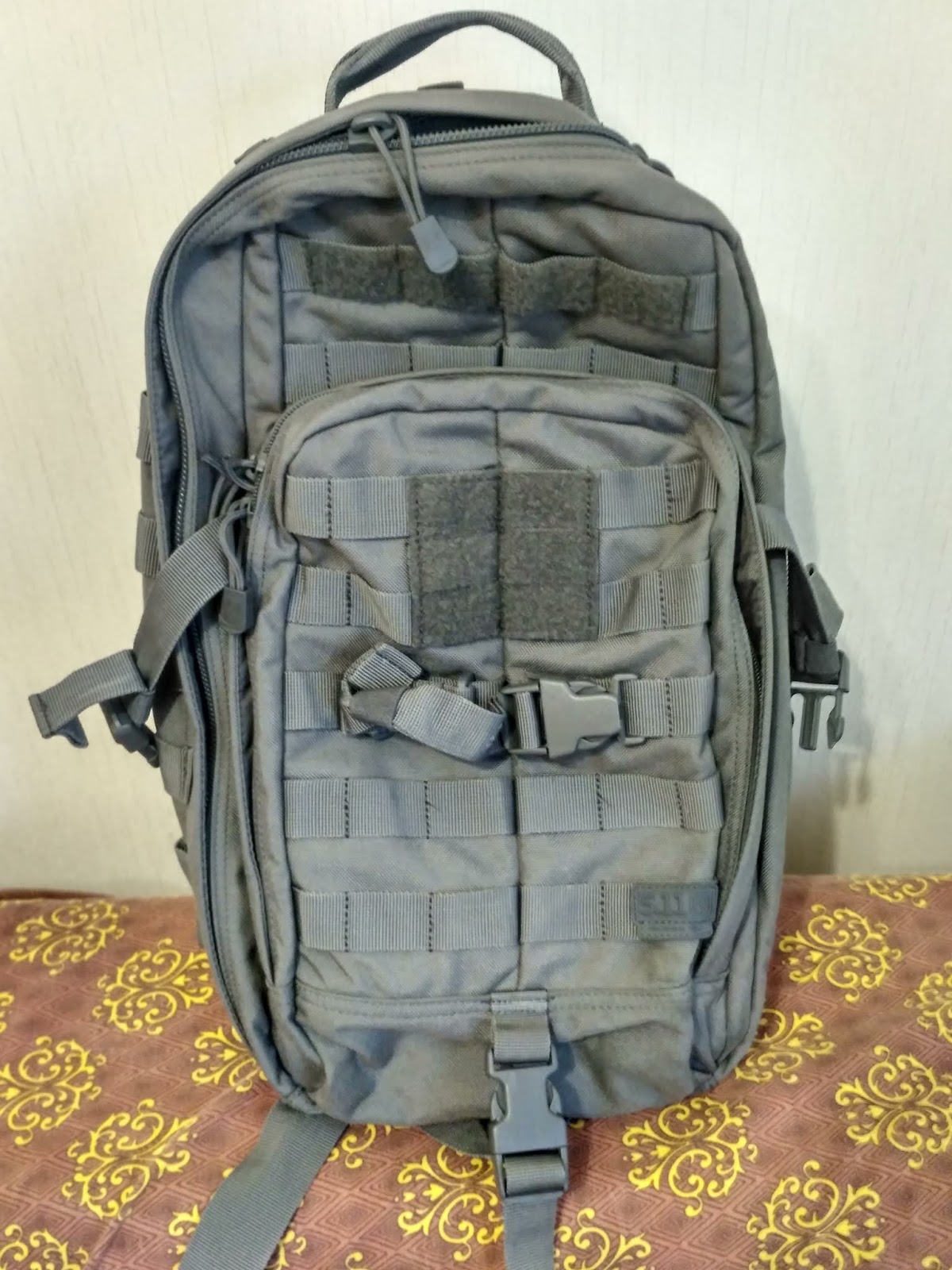 The 5.11 RUSH MOAB in STORM color โ a pretty interesting bag, with several pockets on the strap and generally quite decent (though not cheap by Ukrainian standards). Real-world use revealed two non-obvious drawbacks: