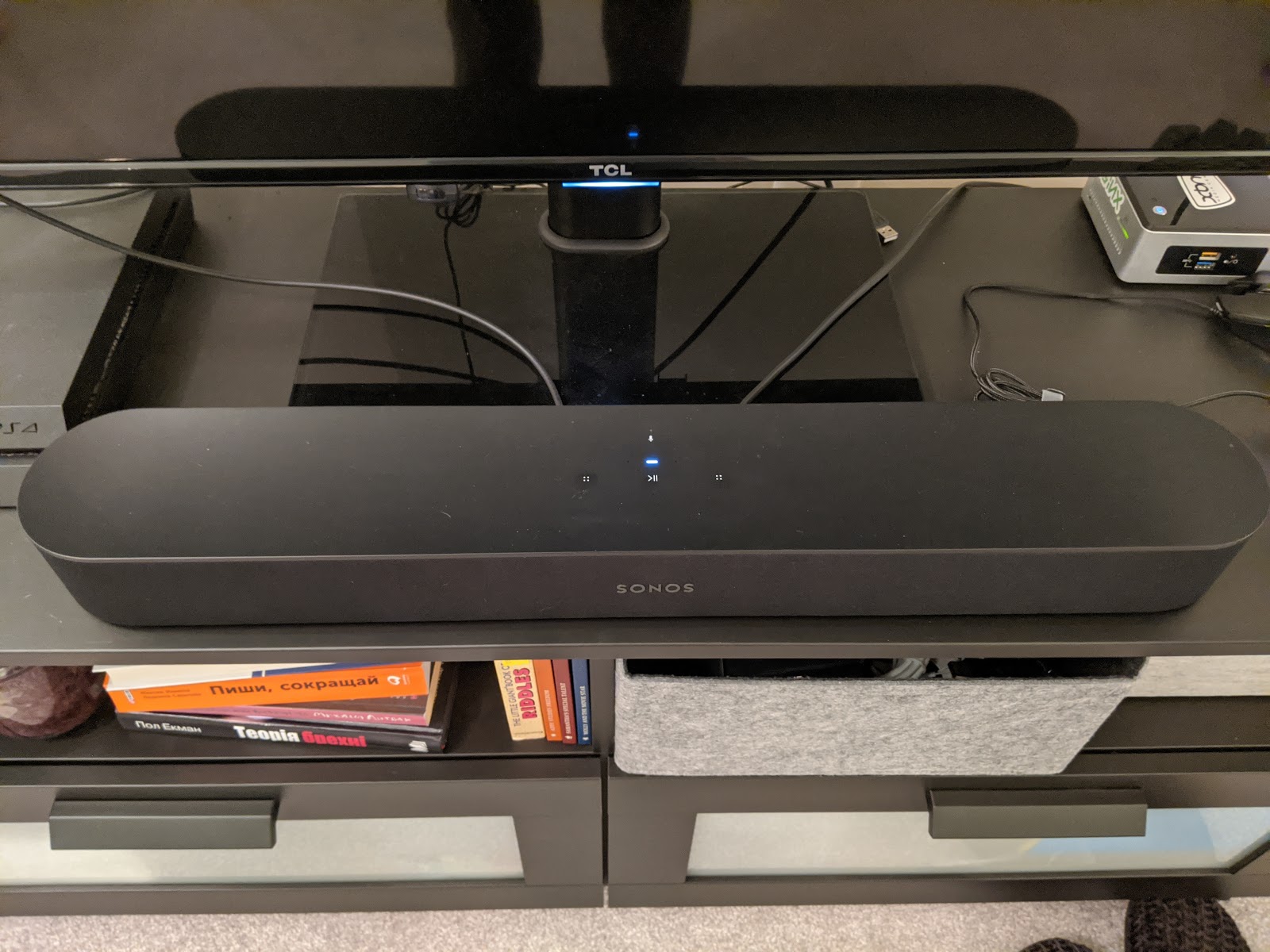 This pre-New Year’s Christmas gift triggered yet another purchase — the TV’s stock legs were too short, shorter than the soundbar, and the soundbar was blocking the infrared receiver for the remote. And placing it behind the TV just did not sit well with my sense of aesthetics — and not only because I wanted to show off to guests (who never come anyway) what a fancy speaker I’m paying off on credit, but also because I wanted to use the touch panel — back then there was no cat yet — and also just because it looked bad. So I bought a center stand for about half the price of the TV, with adjustable height, to lift the TV above the soundbar. The things people will sacrifice for the sake of music…