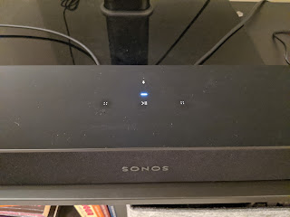 With the soundbar, the TV lit up with new colors and rang with new sounds. Setup is just as simple — the app on the phone says “I see a speaker here, go ahead and press the button on it” — you press it to confirm the speaker is yours, it does some internal magic and boom — now there are two speakers, and all those hundred million streaming services and the offline music library can play through both of them. Over the air.