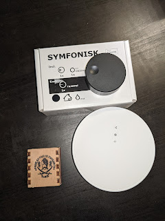 And the round puck on the white speaker — that’s the wireless dial remote. It can control any speaker (or group of them) — volume, and a click for pause, double/triple-click for previous/next track. As a bonus it’s also magnetic on the back (and a matching metal plate and double-sided tape are included in the box), so the first one went straight onto the fridge.