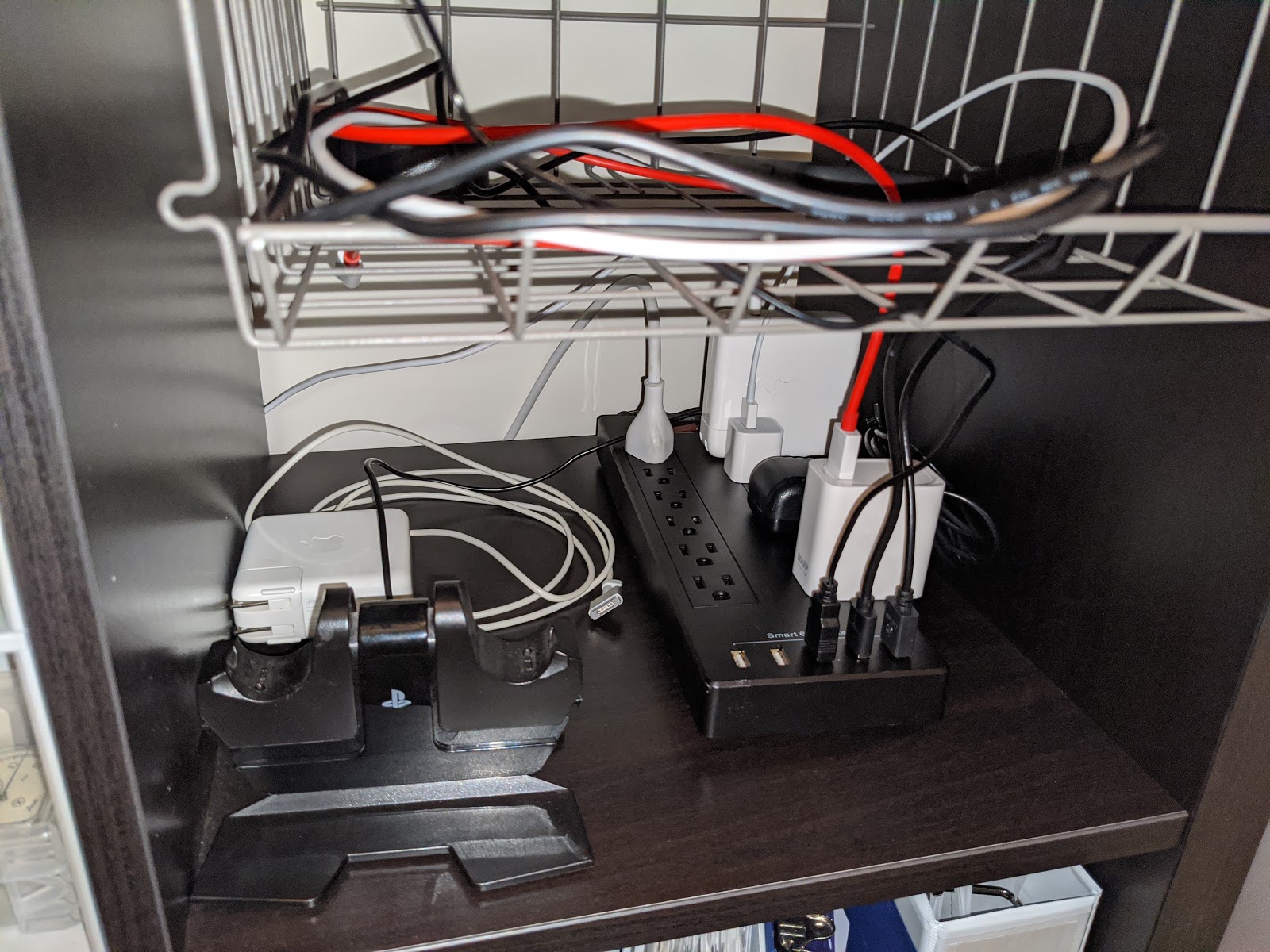 In the photo — one cube of the IKEA KALLAX shelf with a matching basket. Chargers on the bottom, devices in the basket. Beautiful, ventilated, convenient.