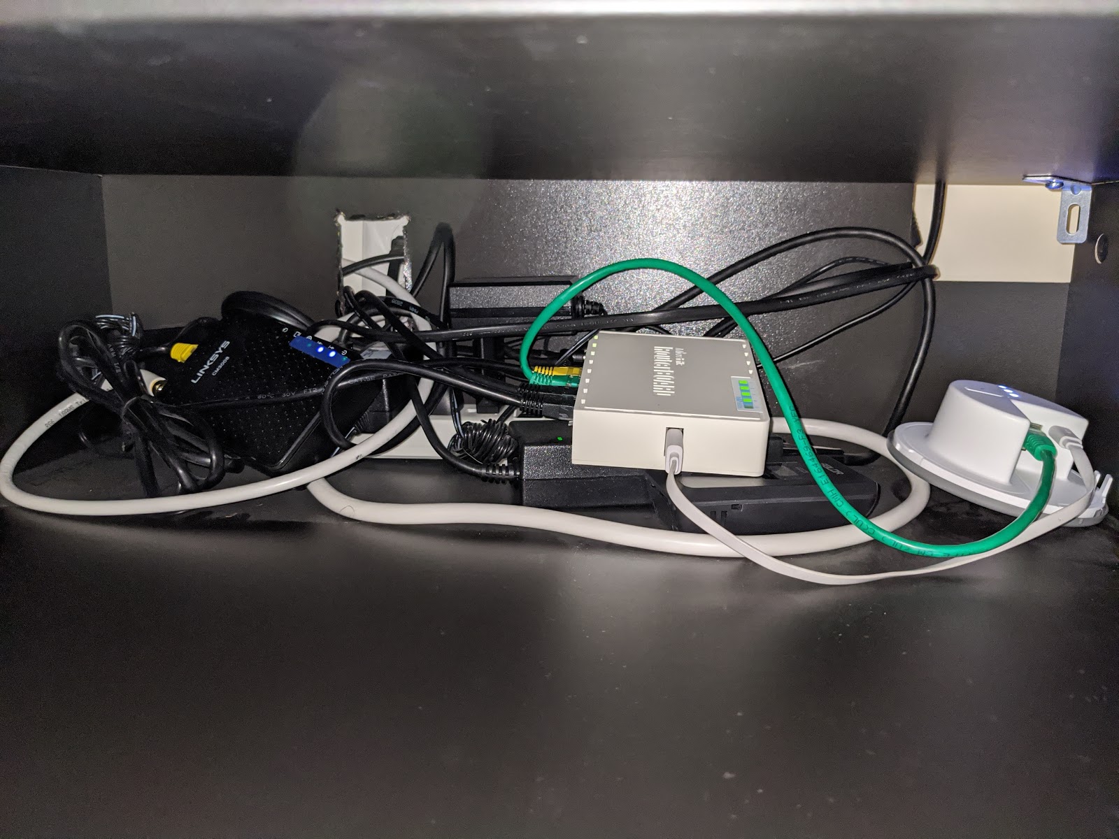 So I’ll have to stuff it (the UPS) into the nerve center of my digitalization setup — specifically, into a small shelf in the under-TV cabinet where everything lives: the cable modem, the router, the IKEA router for their smart home, the power brick for the Synology (a hefty one), the power brick for the Intel NUC, and a tangle of cables between them. This whole operation is sealed off from the cat so he doesn’t crawl in for the warmth, and as a result, with no adequate ventilation it gets even hotter in there — so there’s also a wireless temperature/humidity sensor sitting in there, which I only care about for the temperature reading (32°C on average). Incidentally, today’s setup is only possible thanks to the failure of a previous project to move the Synology into a closet (couldn’t find the right cable for the socket) — had I spread the server and other junk across different rooms, one UPS wouldn’t have been enough.