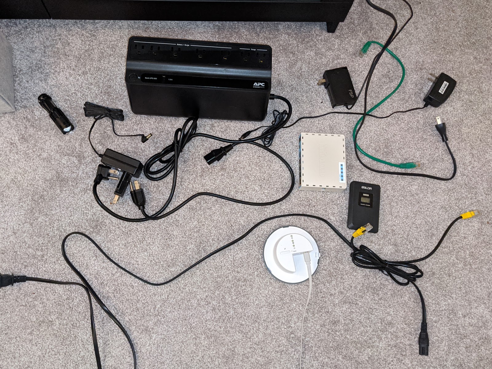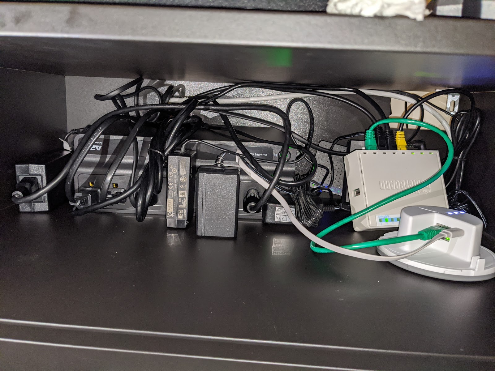 Deep in the clutter you can see a white 6-outlet power strip; the UPS has seven ports plus a USB port, which is very handy — right now the IKEA hub is powered from a MikroTik port, and thank God that port exists on the MikroTik, because there’s simply nowhere left to plug in another power brick. Whoever wired this room was extremely stingy: right where the TV cable comes out — where any normal person would put at least two double outlets — they put just one. The TV, the power strip — and that’s it. But now things are about to get better!