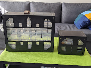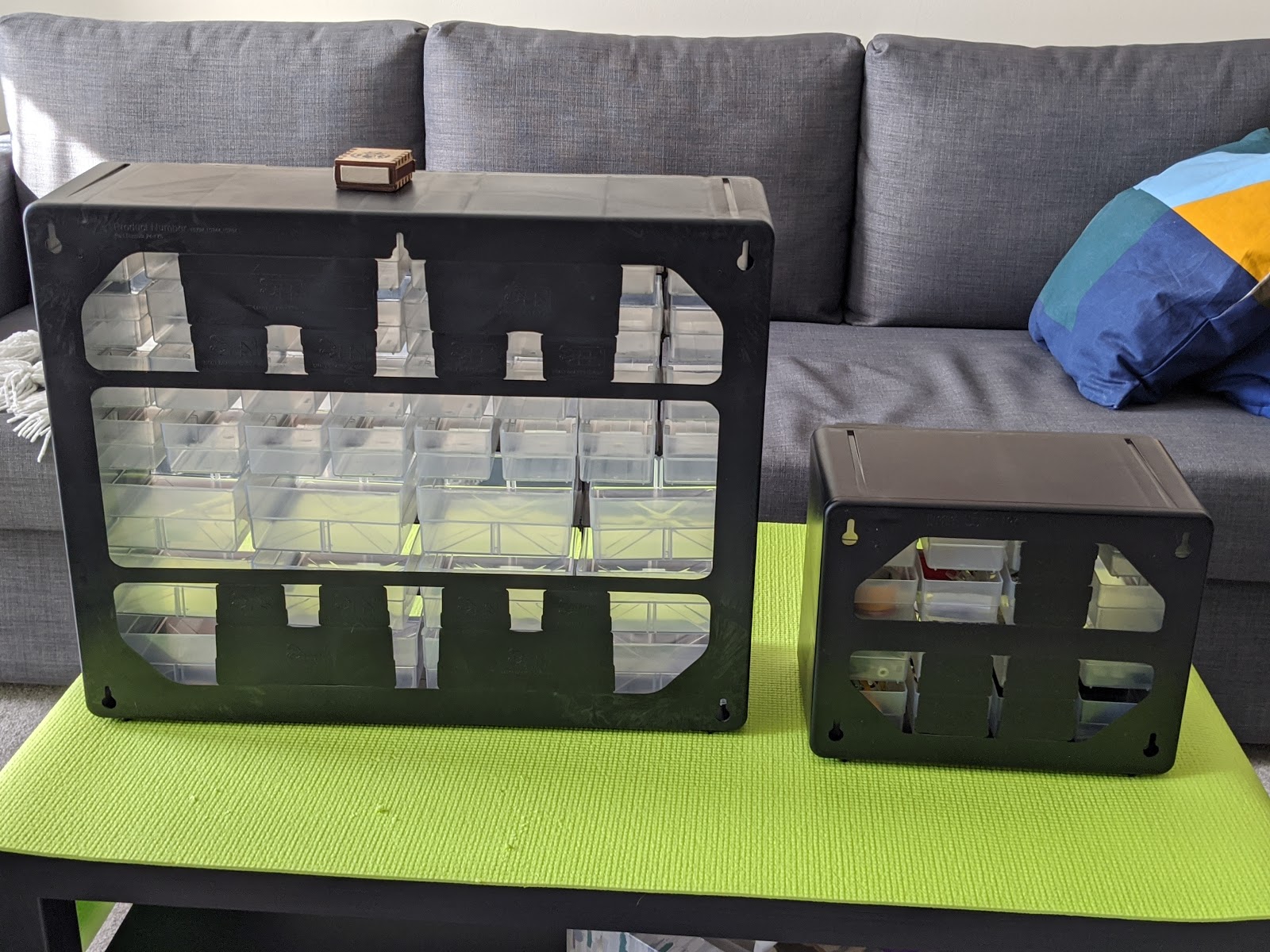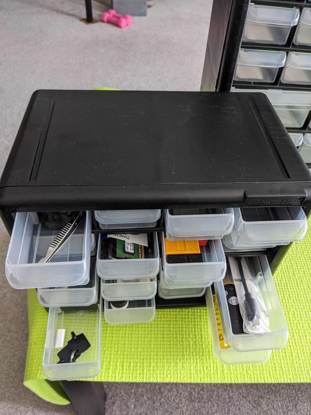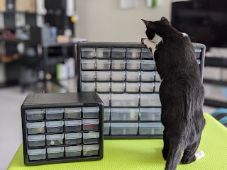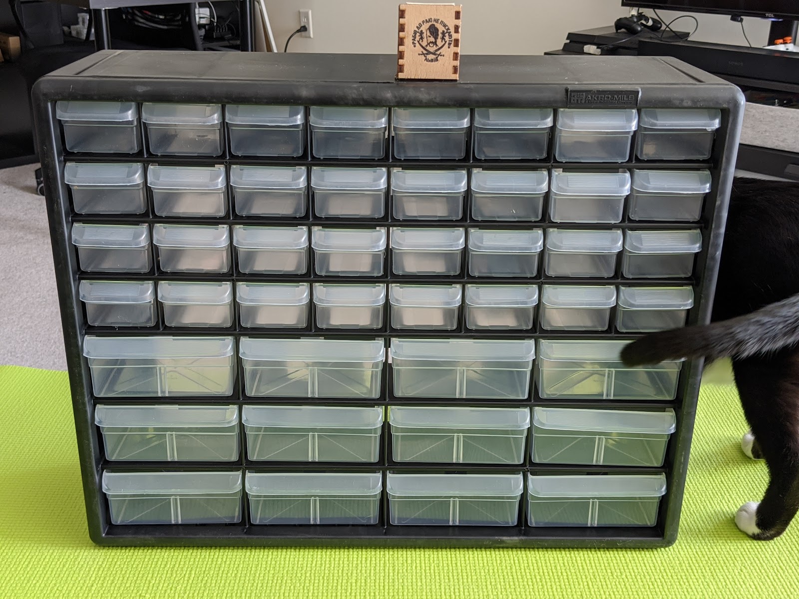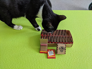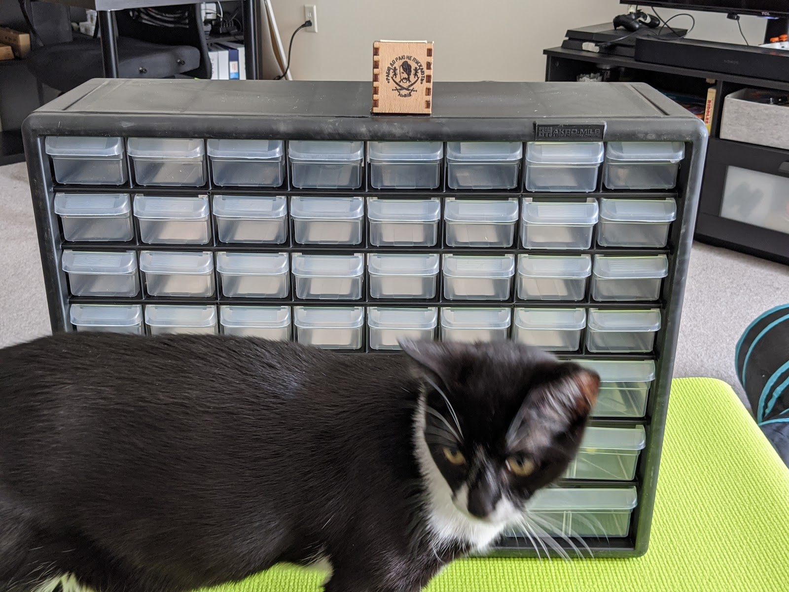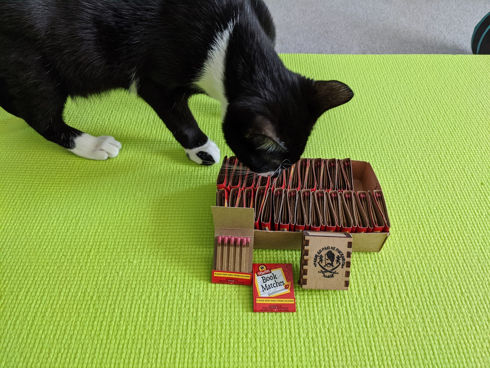 And here is what arrived to me in packaging proudly labeled “Made In USA” — a bigger box of boxes! It’s a bit larger than a matchbox, shown for scale. And a cat for scale too. The creature really wanted to get into the frame, so it helped however it could.