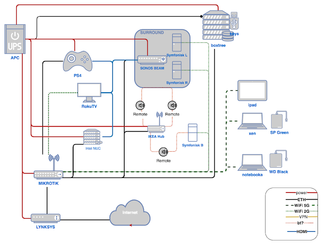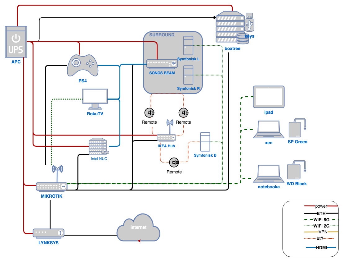 Working from home has shown that Wi-Fi can sometimes be unstable — it’s still unclear whether it’s the microwave oven or something else. So I’m going to try connecting the laptop the good old way, with a cable. The one catch is that my router only has 5 Ethernet ports, and all 5 are currently occupied. I decided to tackle the problem systematically — first draw out what’s connected where, then figure out where to plug what, whether to get a PoE switch or a plain one, whether to save money and go with Fast Ethernet or go for Gigabit after all… The price range runs from $10 for the simplest 100 Mbit switch to $60 for a Gigabit one with PoE. While the deliberation is still ongoing — here’s what a simple home network diagram looks like. Of course, there are still a few components missing from it; I’ll keep adding them little by little….