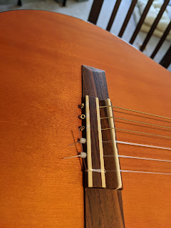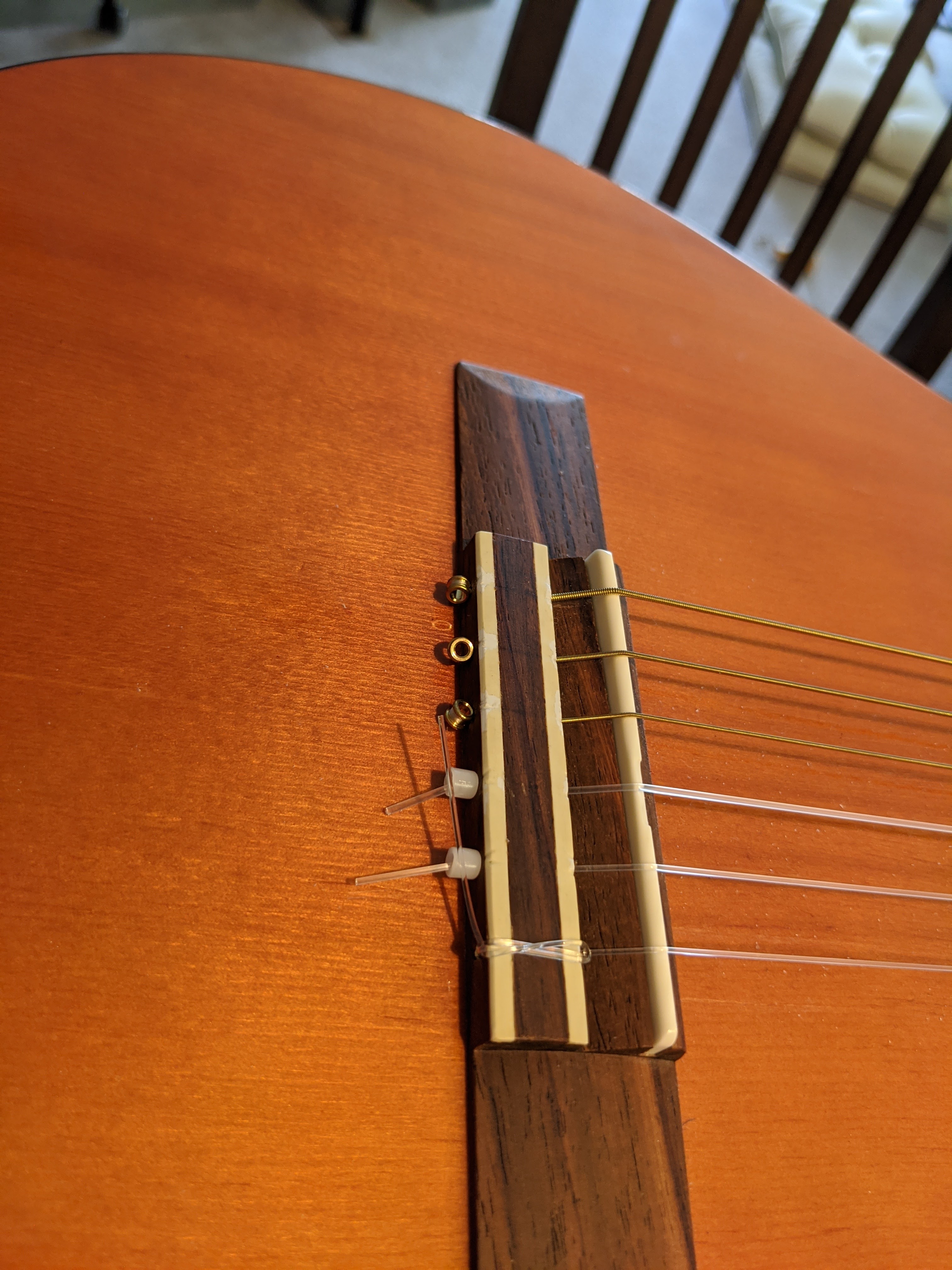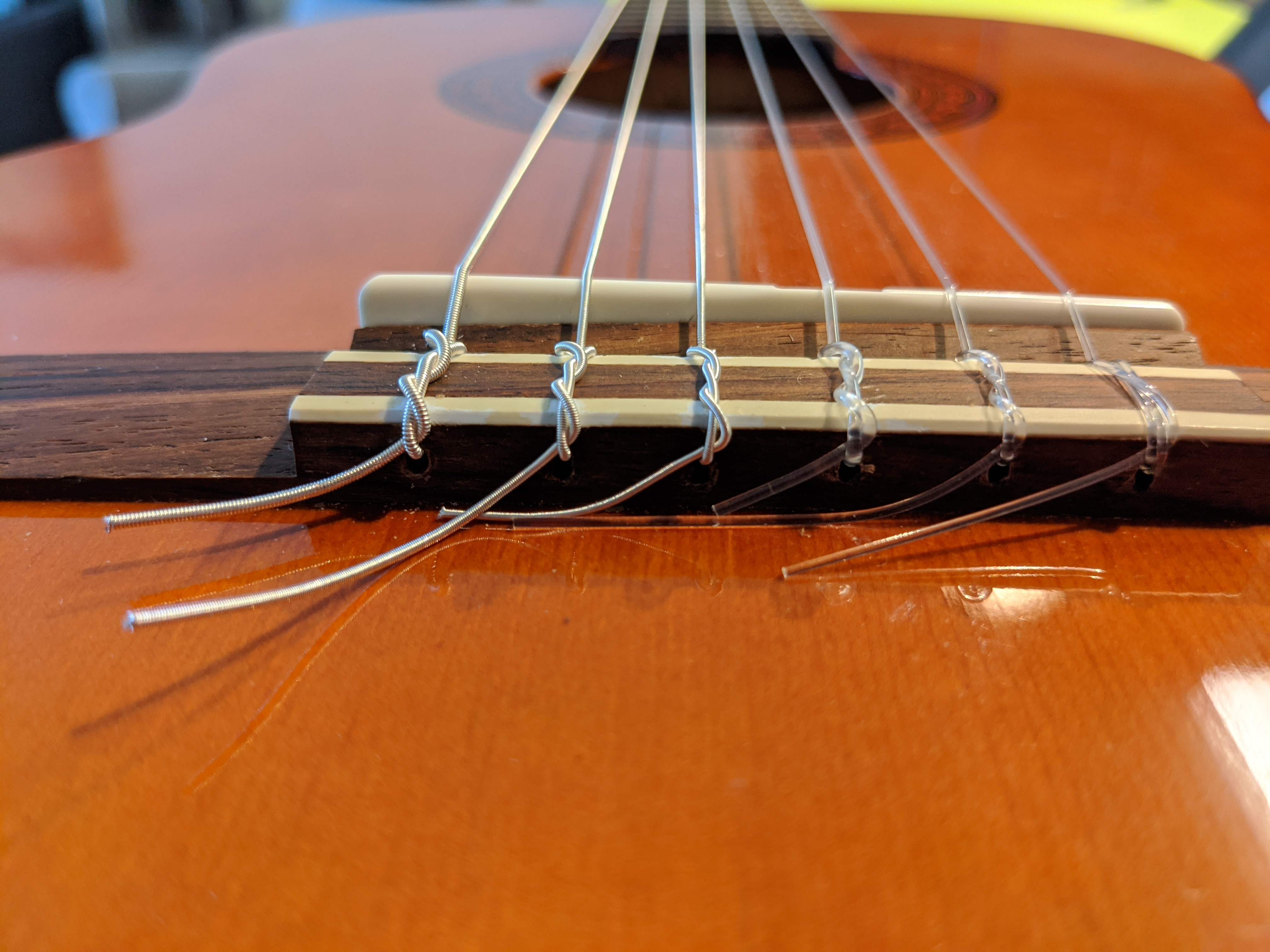 What was on it before — unknown. I put on a Yamaha NS 110 set for $13 and ordered a couple of simpler sets for the future. Of course, all the knots and windings are still settling in; I hope I did everything right and won’t have to rewind them.