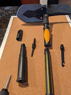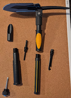 The shovel itself also has extra functionality — one edge is sharpened, the other is a saw, there are two holes for bolts, and of course — a bottle opener for beer! Oh, and the blade can be locked flat like a shovel, or at a right angle, like a hoe.