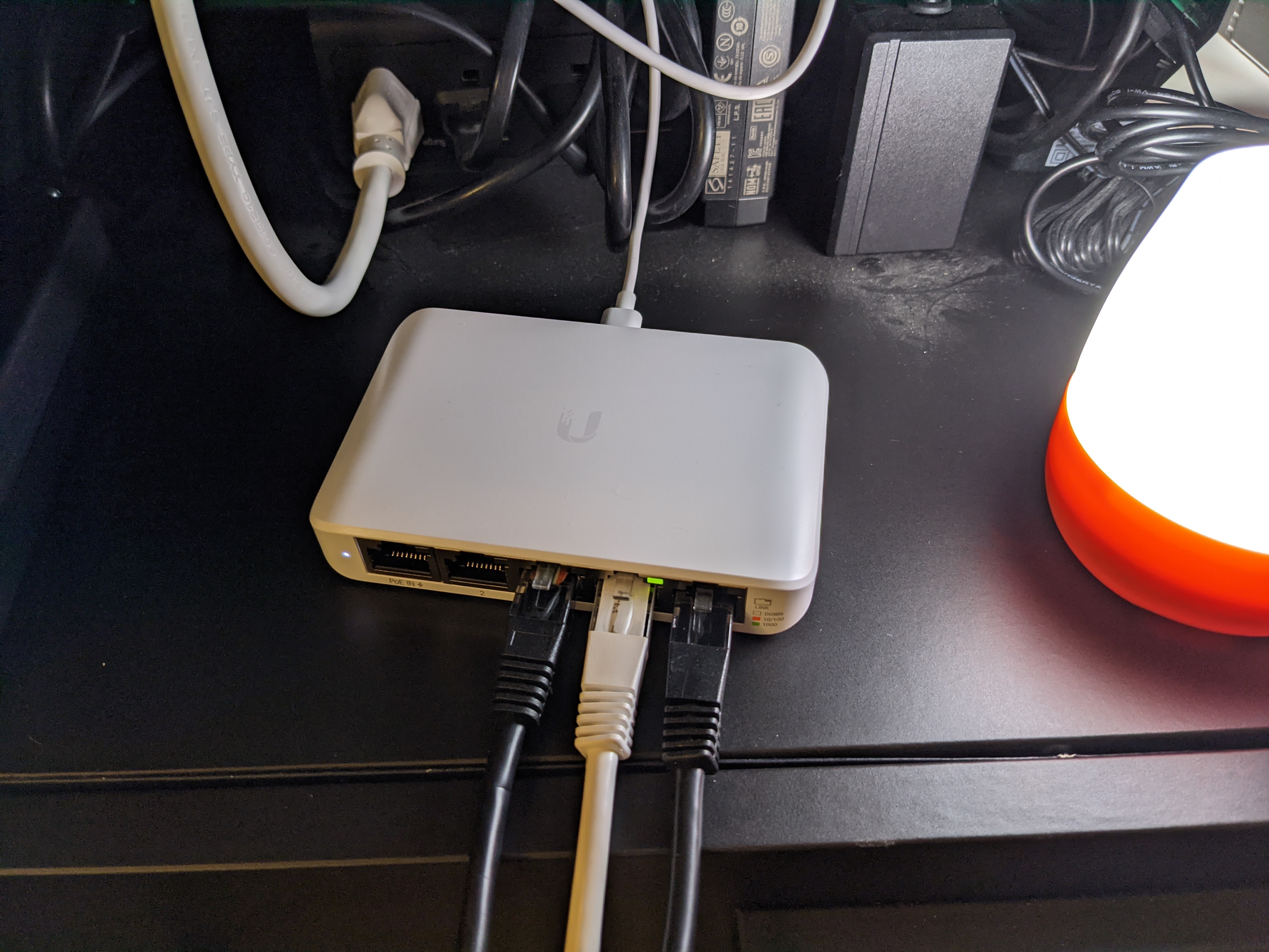 Since I was already digging around in the cabinet where all the cables are stashed, I decided to finally put the gigabit Ubiquiti switch to use — it’s been sitting around for a few months now. I bought that particular one because it has PoE IN, and my router has PoE OUT, with all the UPS outlets already taken. However, for reasons unknown to me, the switch refused to power on via PoE, even though the router dutifully reports in its interface that a recipient device has been found and power has been enabled. Found a short extension cord and a two-port USB charger in the drawer — now the TV and the switch are both running off a single UPS outlet. Well, now my sad two devices that actually have gigabit will be able to ping each other faster.