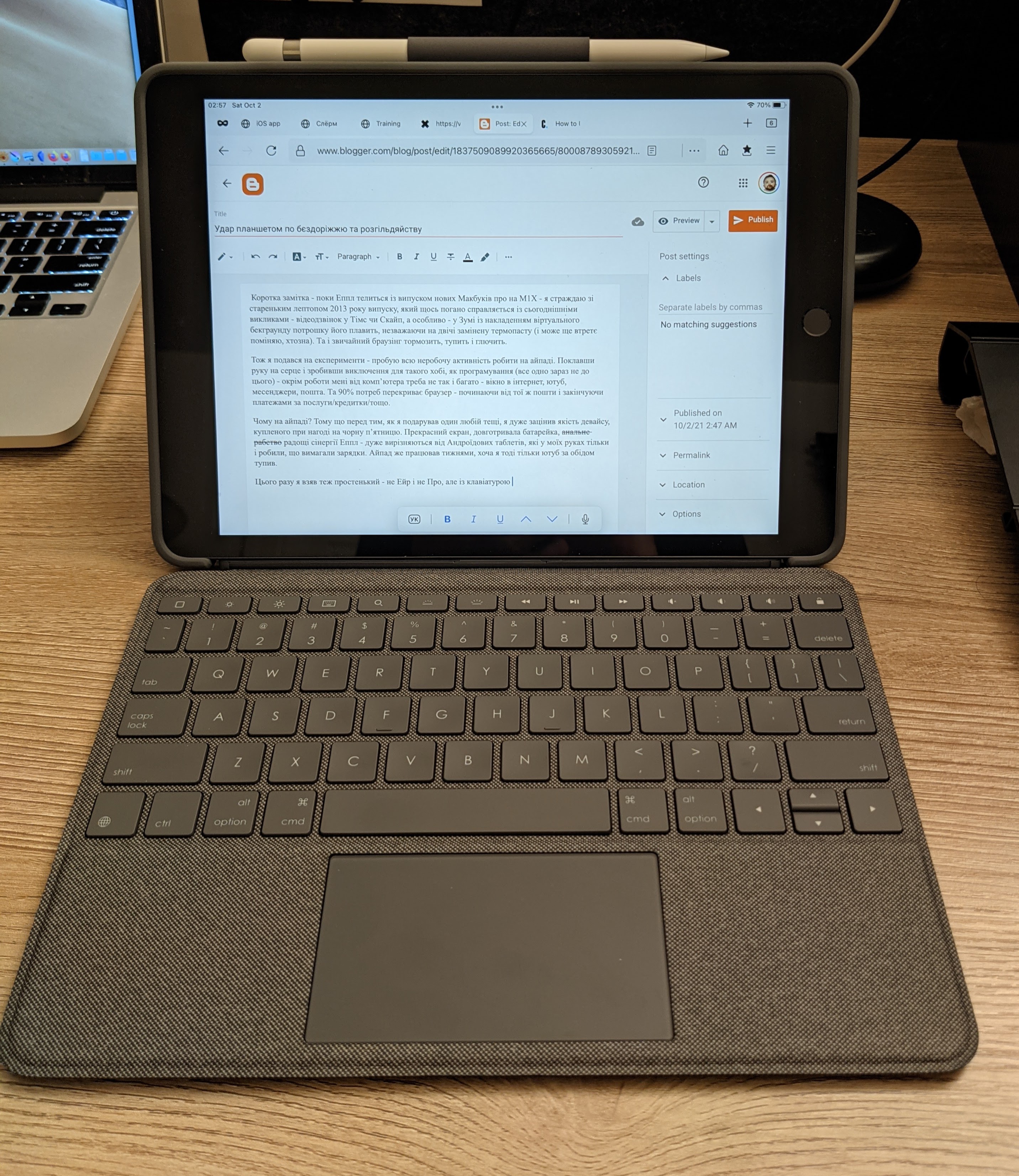 So I went experimenting — trying to do all non-work activities on the iPad. Hand on heart, and making an exception for hobbies like programming (which I don’t have time for anyway) — besides work, I don’t need all that much from a computer: a window to the internet, YouTube, messengers, email. And 90% of my needs are covered by a browser — from email to paying bills/credit cards/etc.